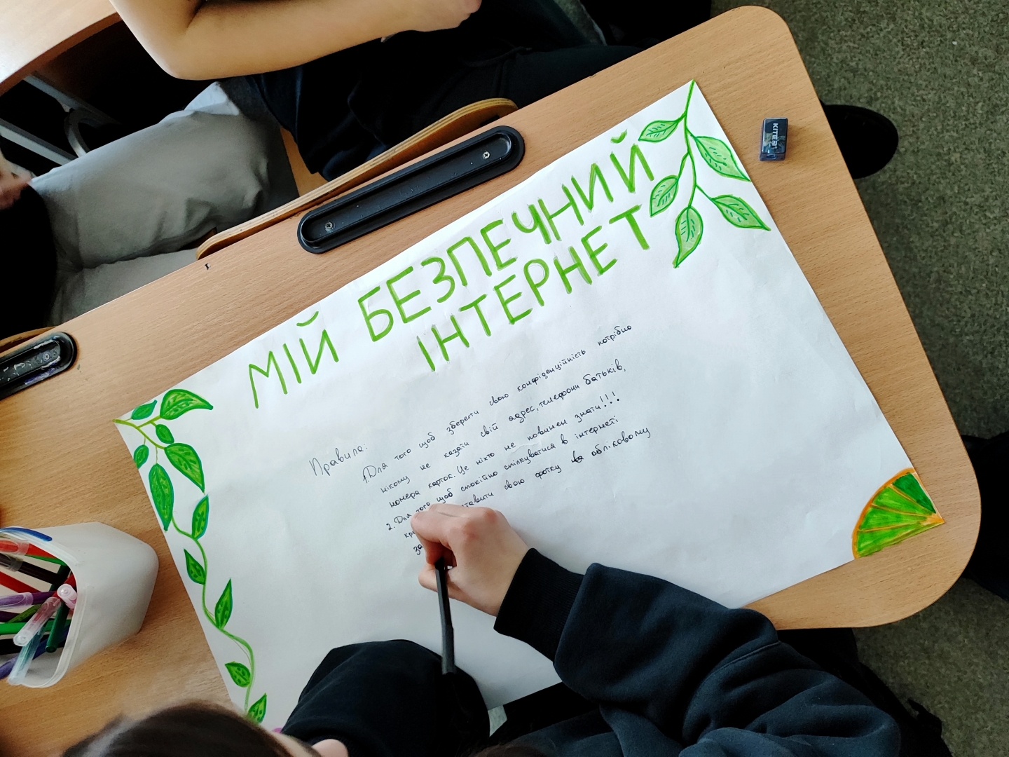 Окрему увагу приділили розробці власних правил безпечного користування соціальними мережами та месенджерами. Під час перегляду інформаційних відео діти аналізували, як алгоритми впливають на наш настрій і чому важливо дбати про цифрову гігієну. Також були проведені вправи з емоційної саморегуляції: «пауза перед відповіддю», техніка трьох запитань до допису та вправи на розвиток критичного мислення. Захід допоміг учням усвідомити, що інтернет може бути не лише простором можливостей, а й середовищем, у якому важливо зберігати власні кордони, психологічну рівновагу та повагу до інших.