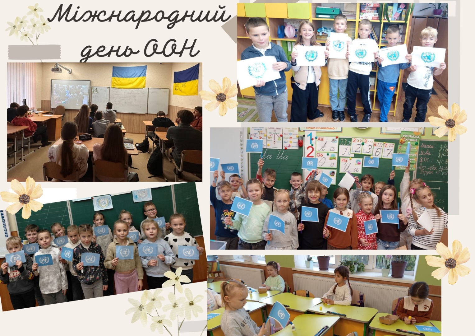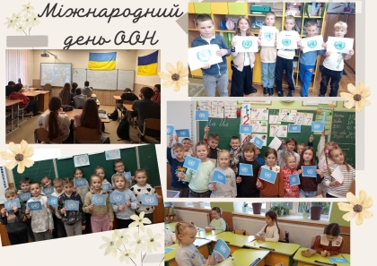Учні початкових класів переглянули цікаву презентацію, присвячену створенню ООН. Вони пригадали, що головна мета організації – зберігати мир у світі, підтримувати справедливість і дружбу між народами. Діти із захопленням розв’язували ребуси, власноруч створили символічні прапорці ООН, обговорювали значення миру та дружби й дійшли висновку, що всі