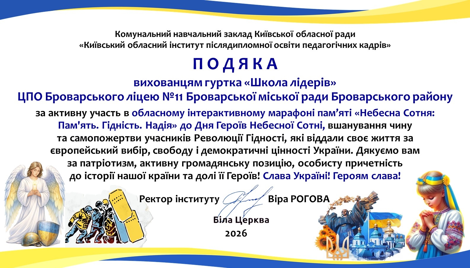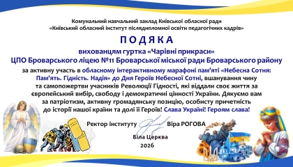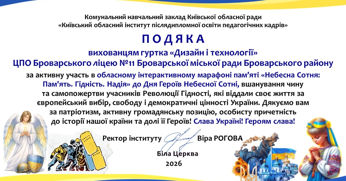 Наприкінці лютого 2026 року Центр позашкільної освіти Броварського ліцею № 11 долучився до участі в обласному інтерактивному марафоні пам’яті «Небесна Сотня: Пам'ять. Гідність. Надія», присвяченому Дню Героїв Небесної Сотні.