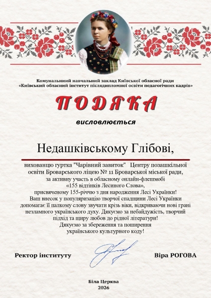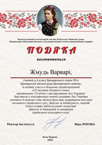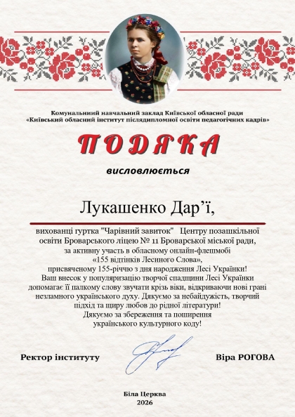 Вихованці Центру позашкільної освіти та учениці Броварського ліцею № 11 активно долучилися до участі в обласному онлайн-флешмобі «155 відтінків Лесиного Слова», присвяченому 155-річчю від дня народження Лесі Українки.