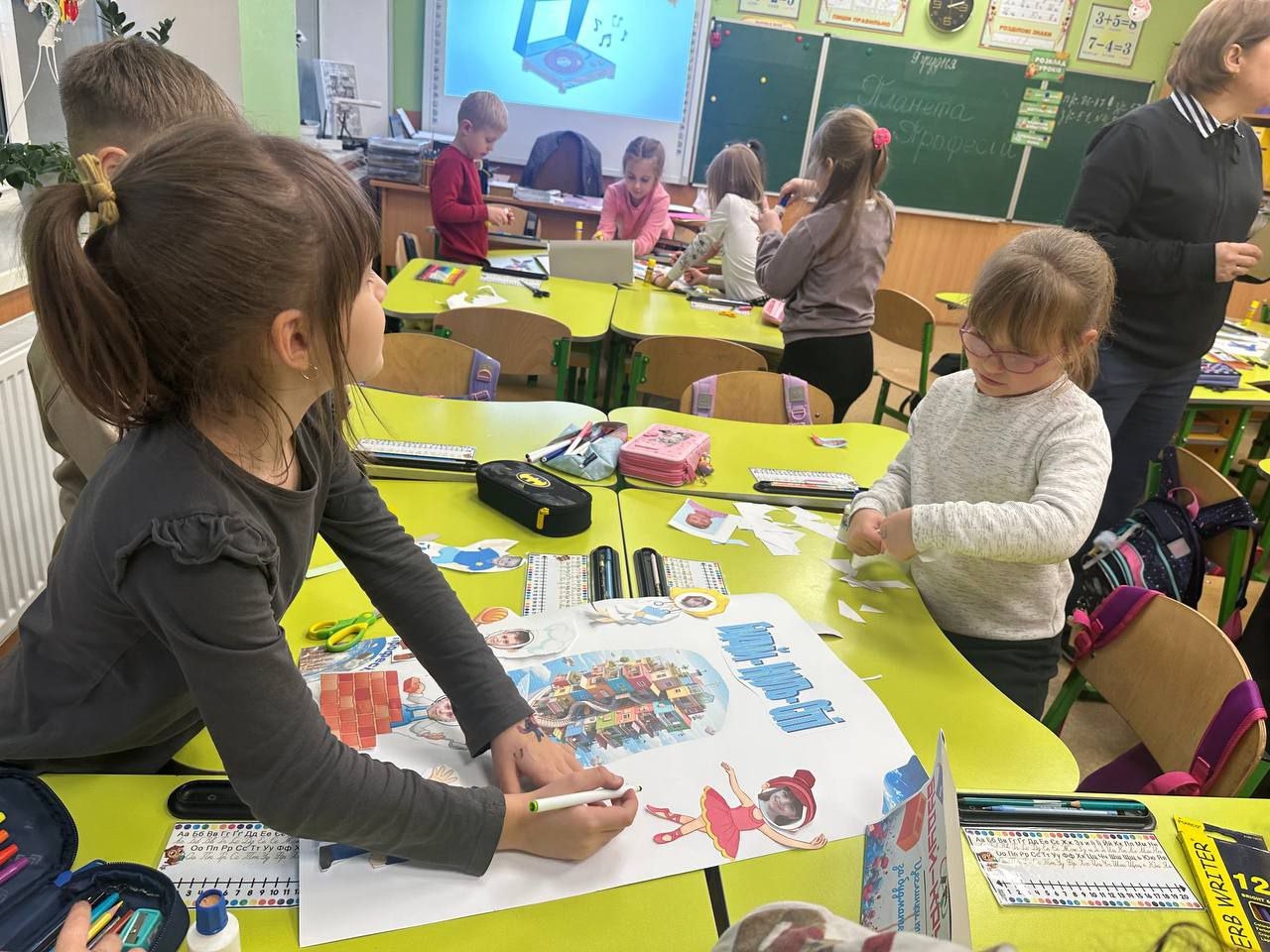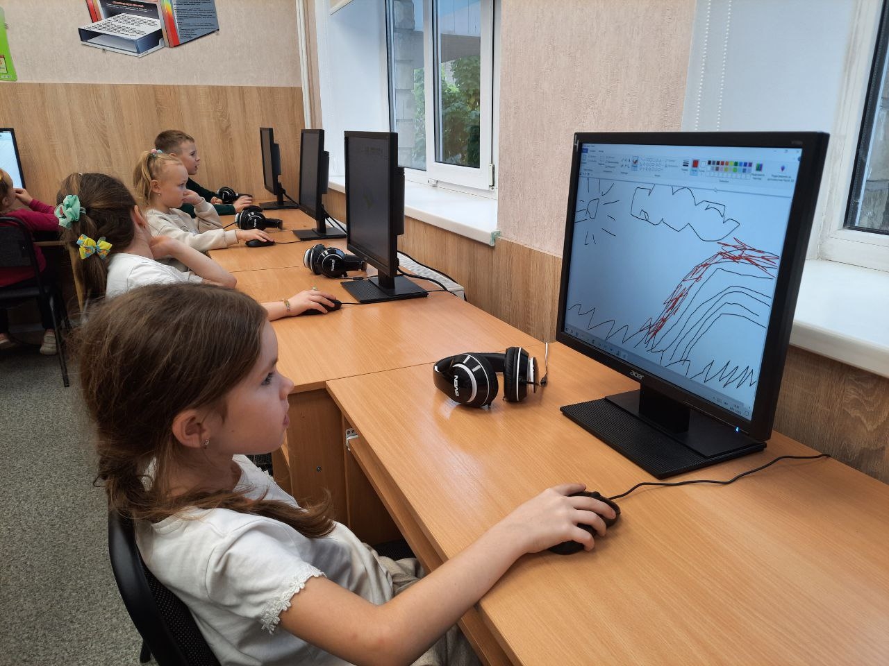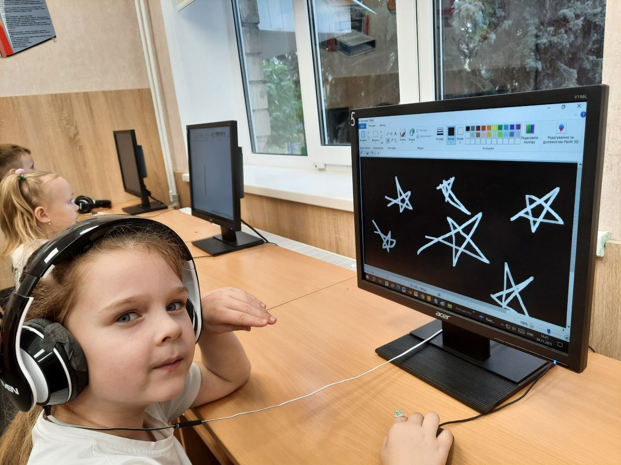 Продовження подорожі чекало на першокласників у Цифровій майстерні — на комп’ютерному гуртку «Інформаційна культура». Цей етап став логічним продовженням теми, адже у сучасному світі майже кожна професія пов’язана з цифровими технологіями. Під керівництвом керівника гуртка діти зробили перші кроки у цифровому дизайні: