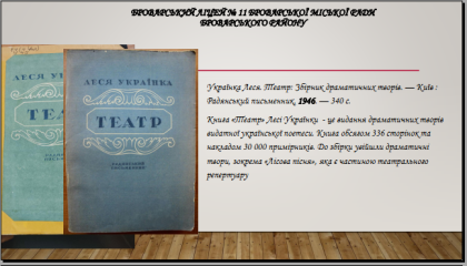 Напередодні 155 річниці від дня народження видатної української поетеси виявилося, що в бібліотеці Броварського ліцею № 11 є найдавніше видання творів Лесі Українки (1946 року) серед тих, які зберігаються в бібліотеках закладів освіти Київської області!