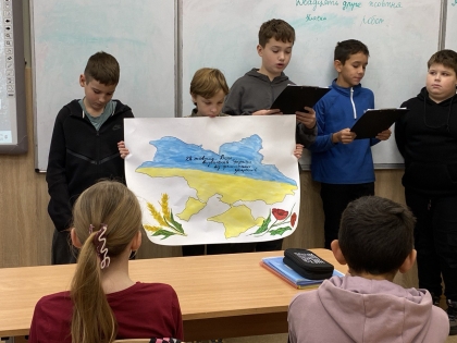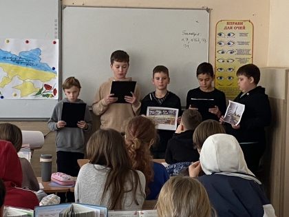 Школярі представили зворушливу віршовану сценку про закоханих, життя яких трагічно обірвала війна. Особливо емоційним моментом став лист із фронту, сповнений болю, туги та віри у мирне майбутнє.