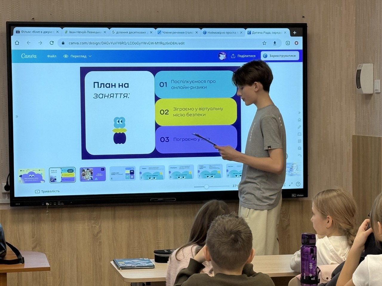 Під час занять школярі доступно та цікаво розповідали про основні правила безпечної поведінки в інтернеті, пояснювали, як розпізнавати кібербулінг та онлайн-шахрайство, ділилися порадами щодо захисту персональних даних і відповідального користування соціальними мережами. Уроки супроводжувалися інтерактивними вправами, обговореннями та практичними прикладами, що сприяло кращому засвоєнню матеріалу.