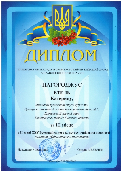 Вихованки художньої студії «ДіАрті» Центру позашкільної освіти Броварського ліцею № 11 (керівник Олена Бєлановська) стали переможцями ІІ (територіального) етапу Всеукраїнського конкурсу учнівської творчості «Об’єднаймося ж, брати мої!».