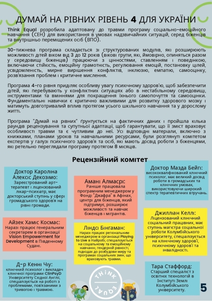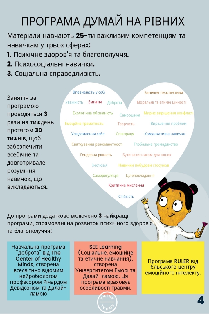 У Центрі розвитку дитини протягом двох навчальних років реалізується міжнародна програма «Think Equal», спрямована на розвиток соціально-емоційних навичок у дітей дошкільного віку. Програма створена для дітей дошкільного віку і допомагає формувати у них важливі життєві компетентності: емпатію, доброзичливість, повагу до інших, уміння розуміти власні емоції та взаємодіяти з людьми.